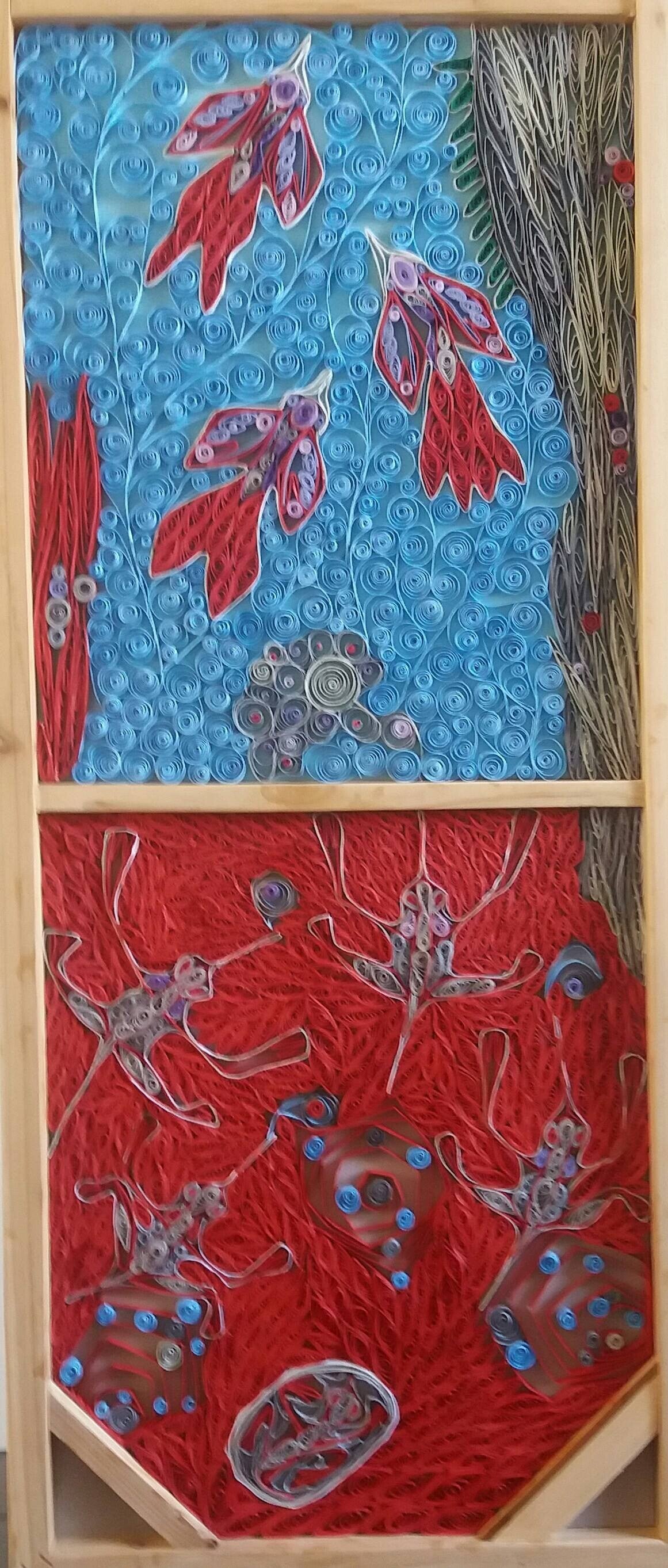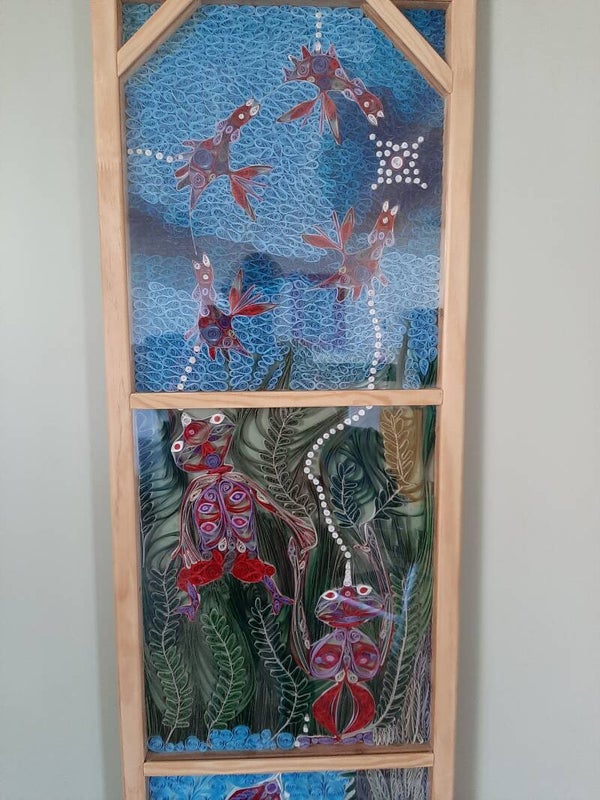 Laat je meevoeren in een fantasierijke wereld waar wezens zich vanuit de diepte van de aarde een weg banen naar het licht. Dit unieke kunstwerk is met de hand gemaakt in papier quilling, een techniek waarbij opgerolde stroken papier worden gevormd tot intrigerende patronen en figuren.
