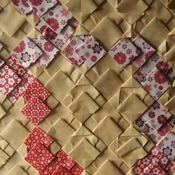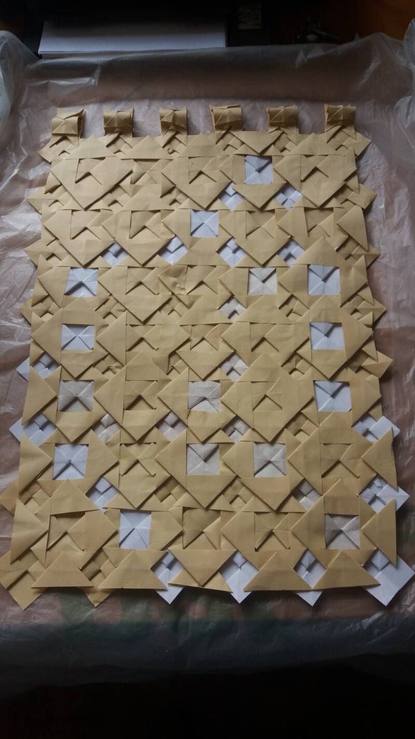 Dit wandkleedje bestaat uit een origamimoduul, uit verschillende papiersoorten, die in elkaar gestoken zijn. Als het licht erdoor schijnt, dan krijg je het goed te zien.