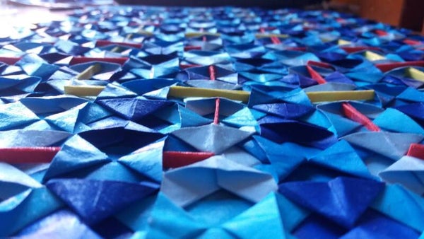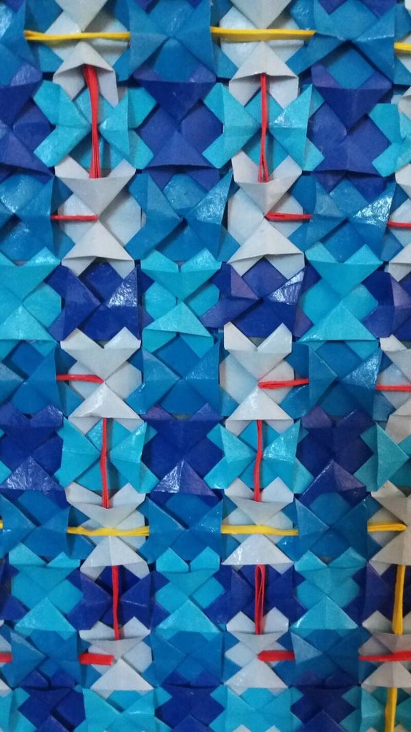 Dit wandkleedje bestaat uit 1 origamimoduul in de verchillende kleuren blauw in elkaar gestoken.De rode en gele horizontale en verticale lijnen geven een speels 3d effect.