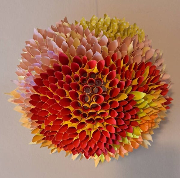 De halve hangende bal bestaat uit gedraaide vierkantjes van tweezzijdig gekleurd papier. Een echte interieurdecoratie die de aandacht trekt en verdient