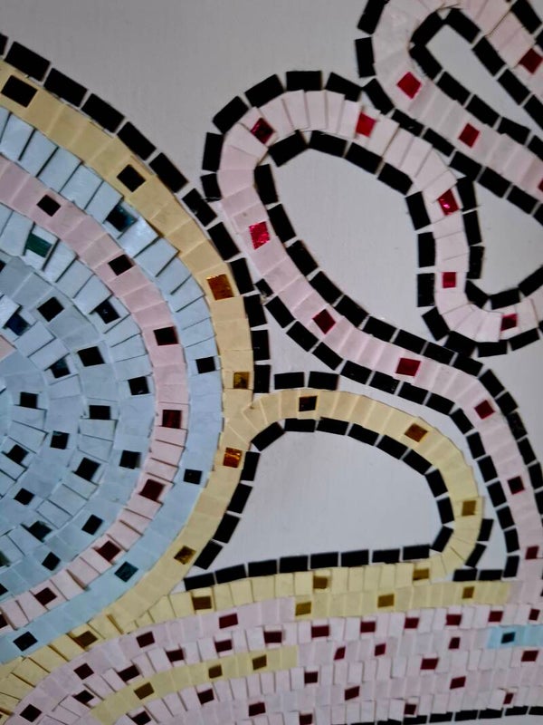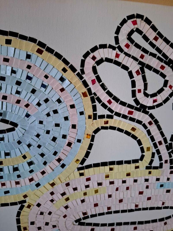 Dit schilderij is gemaakt van karton eerst gesneden 1x1cm. Toen dakpansgewijs aangebracht, waarna kleine stukjes glinsterpapier ertussen gezet. Als finishing touch is het geheel met zwarte strokes omlijst. Afmeting 40x60cm.