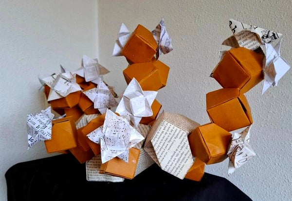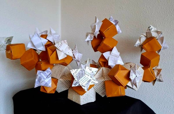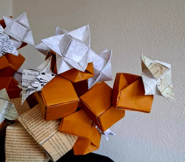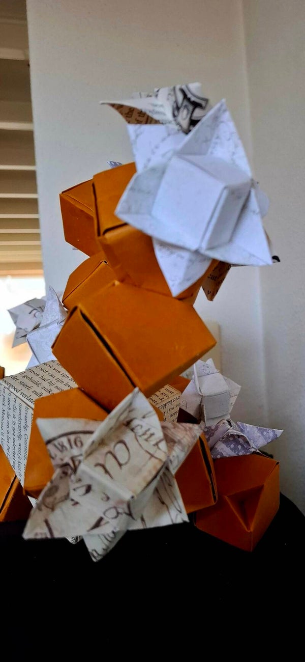 De kubussen zijn gemaakt uit 6 vierkantjes, in elkaar gestoken op verschillende manieren gevouwen. De kubussen hebben dan ook verschillende hoeken. De bloemenzijn uit 3 papierstroken gemaakt .