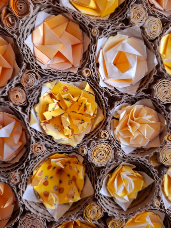 Elke bloem is gevouwen uit 4 tot 6 vierkantjes, deze zijn in elkaar gestoken. Daarna zijn ze door gequilde rondjes aan elkaar gemaakt en in een houten omlijsting van 40 x 40 cm geplaatst. As het licht er door heen schijnt,lijken de bloemen te zweven.