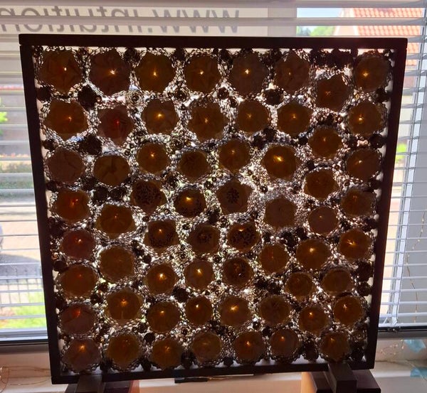 Elke bloem is gevouwen uit 4 tot 6 vierkantjes, deze zijn in elkaar gestoken. Daarna zijn ze door gequilde rondjes aan elkaar gemaakt en in een houten omlijsting van 40 x 40 cm geplaatst. As het licht er door heen schijnt,lijken de bloemen te zweven.