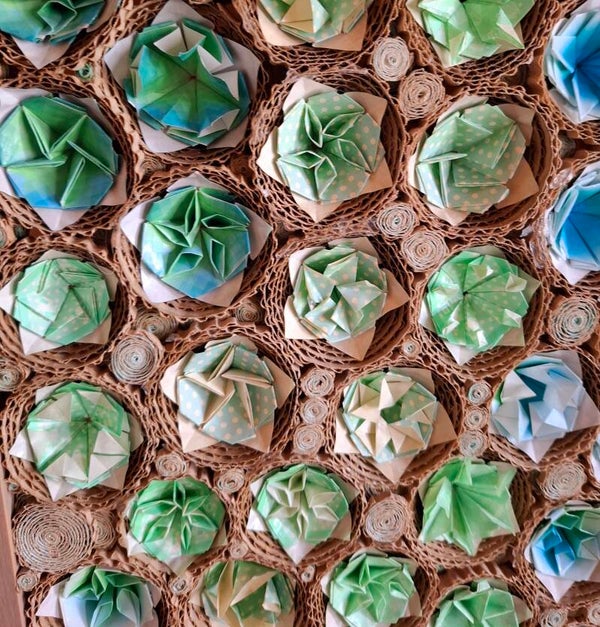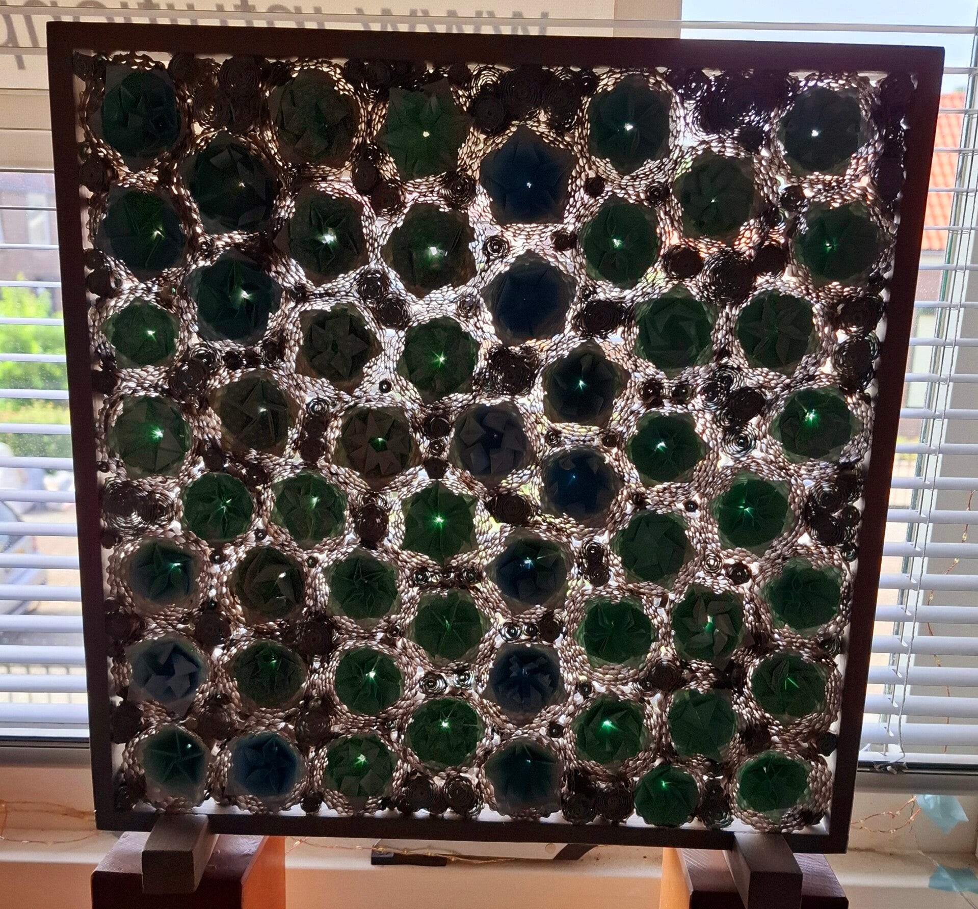 Elke bloem is gevouwen uit 4 tot 6 vierkantjes, deze zijn in elkaar gestoken. Daarna zijn ze door gequilde rondjes aan elkaar gemaakt en in een houten omlijsting van 40 x 40 cm geplaatst. As het licht er door heen schijnt,lijken de bloemen te zweven.
