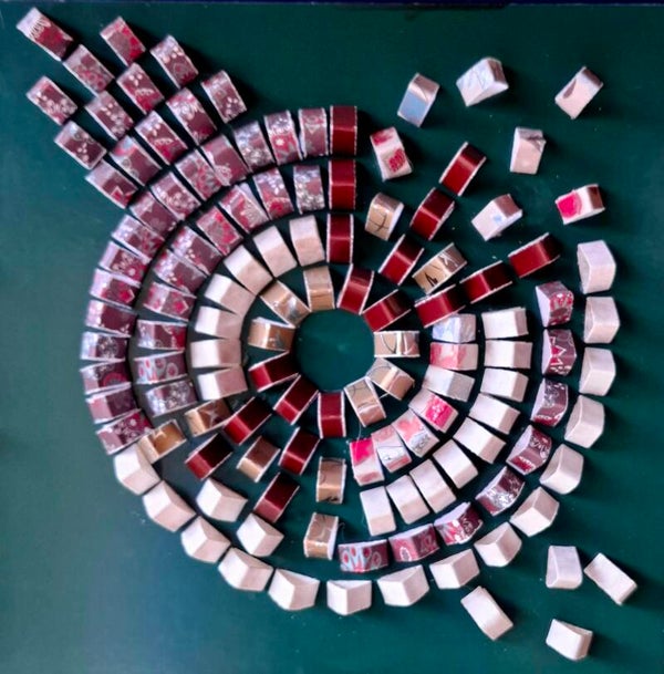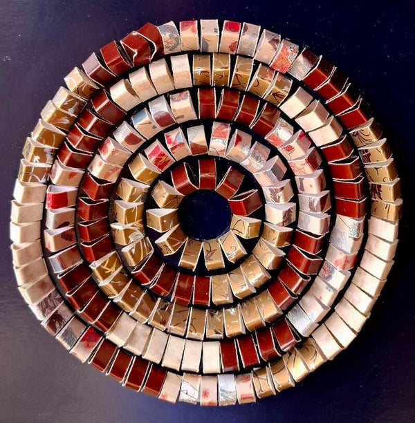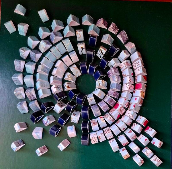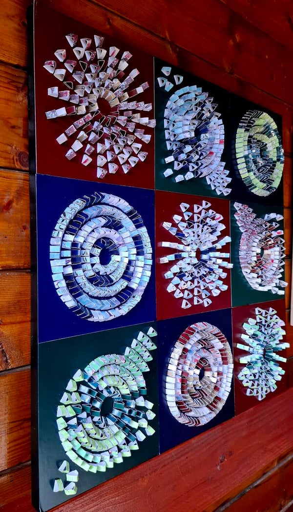 Dit schilderij bestaat uit 9 panelen. De 9 panelen bestaan uit 3 patronen in 3 verschillende kleuren. Ze zijn gevormd uit driehoekjes in een bepaald rond patroon. De panelen zijn bevestigd op een houten plaat. 63×63cm .
