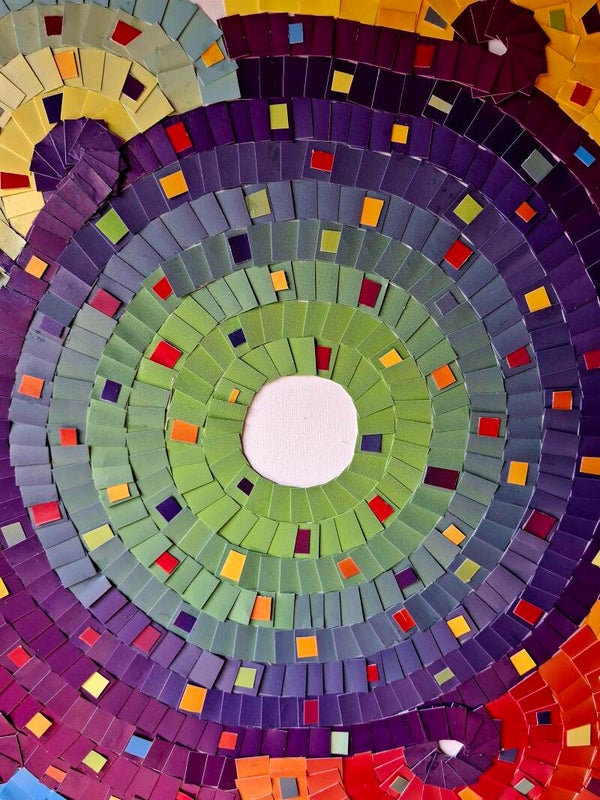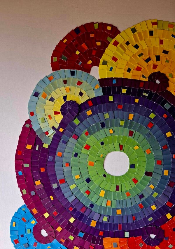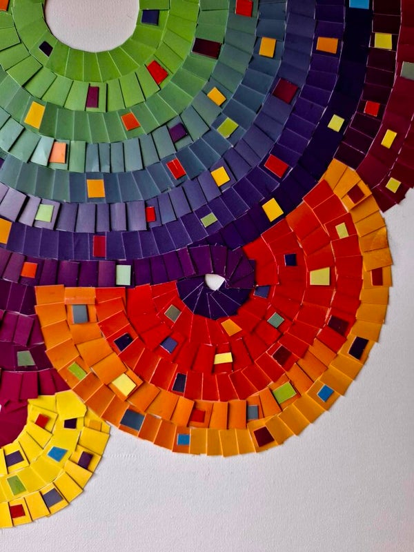 Dit schilderij bestaaat uit stukjes van 1x1cm in cirkels geplaatst op een canvas. Er zijn er tussen smalle strookjes geplaatst. De kleurkeuze maakt het bijzonder. 70x50cm