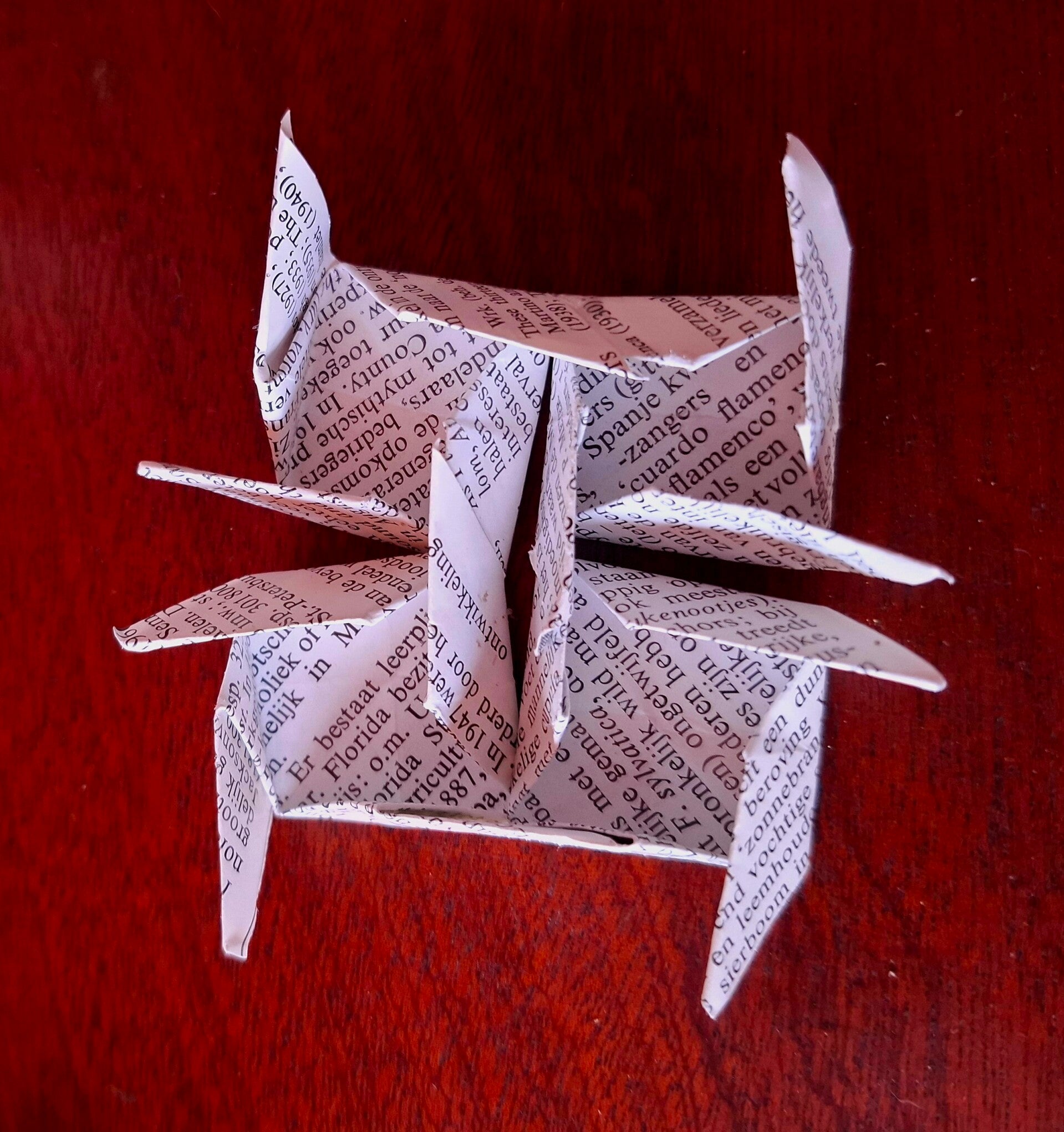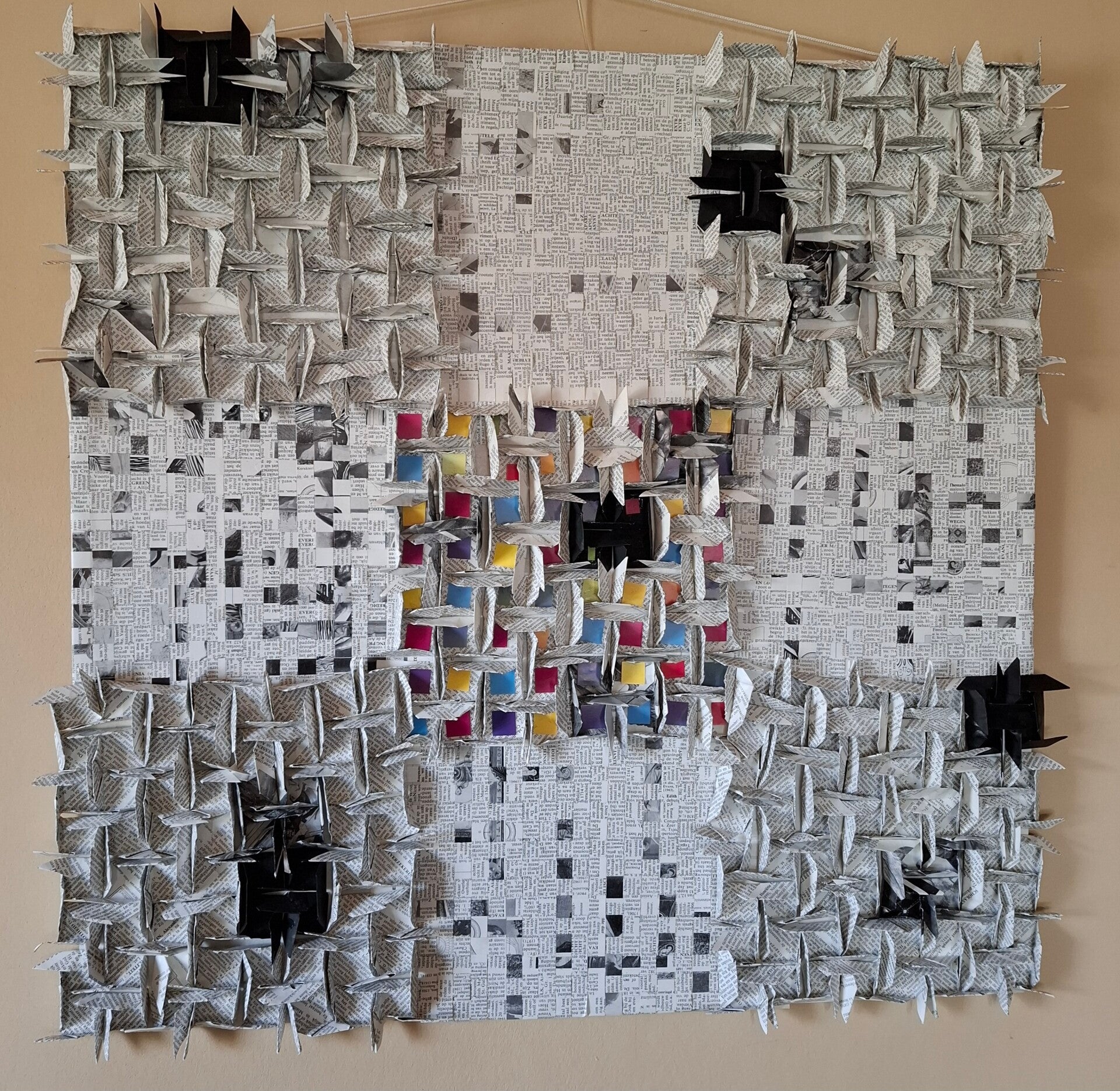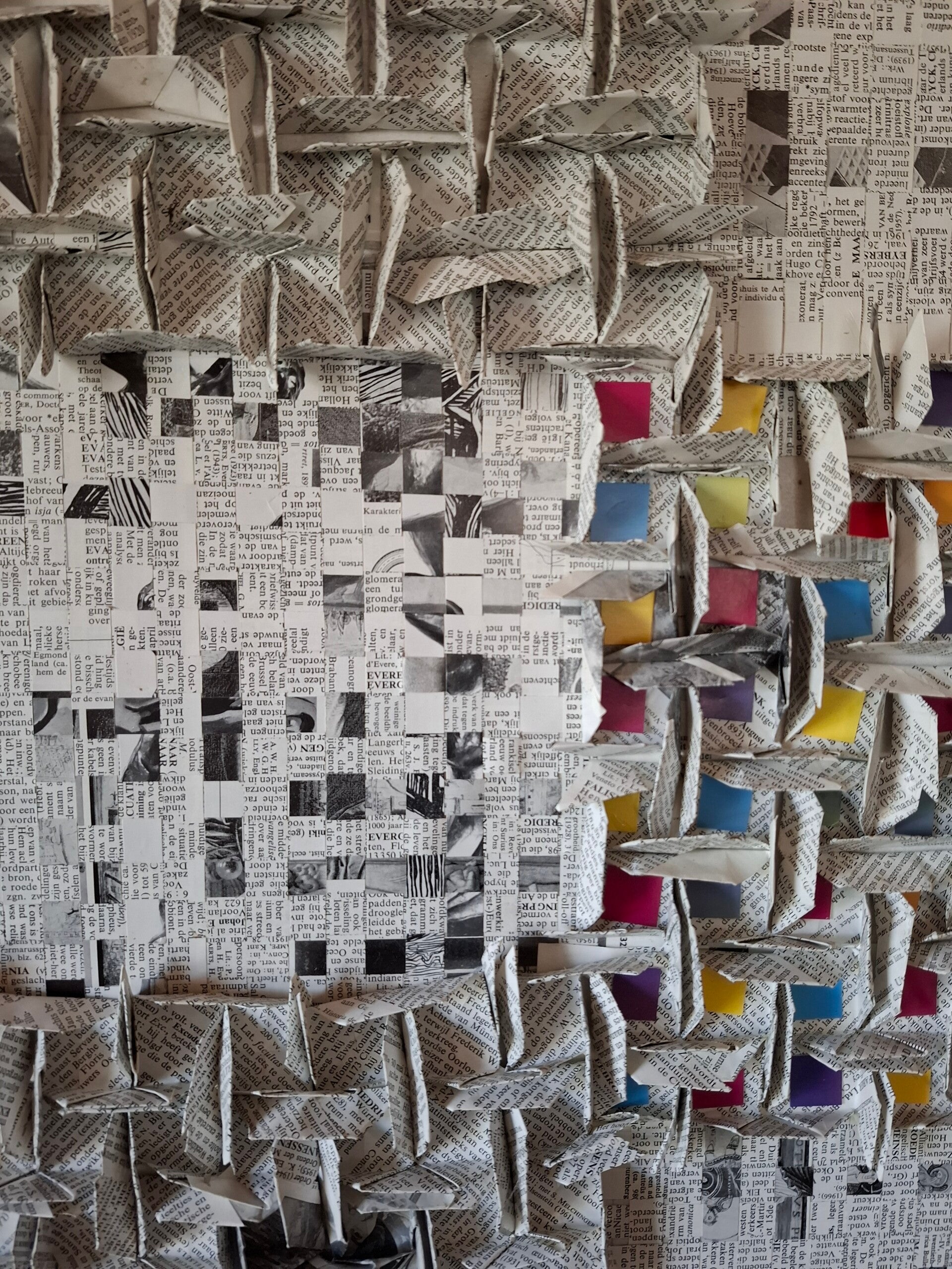 Dit schilderij heeft 2 structuren gemaakt van dezelfde boekpaginas. Bij de een is er stroken gemaakt en gevlochten. Bij de ander zijn er vierkantjes gevouwen. Deze zijn in elkaar gestoken en vormen de 3d structuren. In hetmidden zijn de vlakjes die in de 3d structuur zijn ontstaan gevuld met kleurige papiertjes. Geplaats op hout. 60 x 60cm