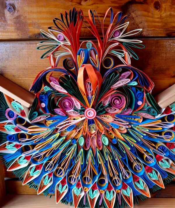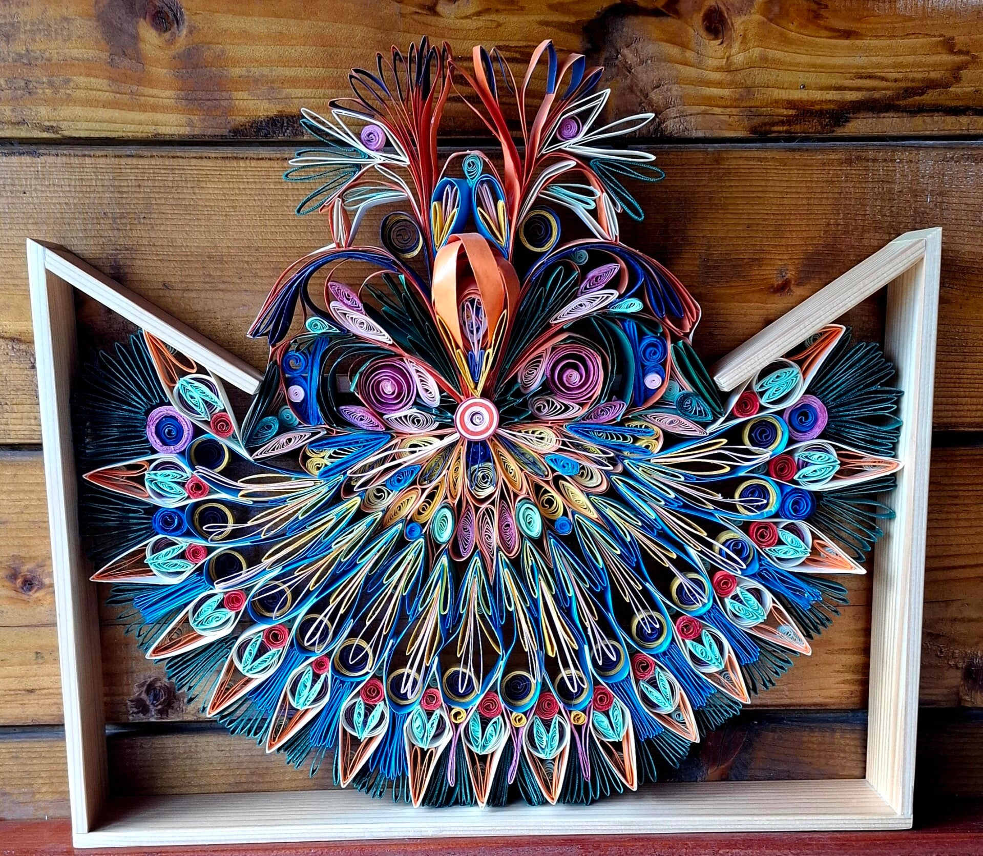 Deze gequilde figuur is geplaatst in een bujzondere houder. Het beeld geeft door de plaatsing een verschillende uitstraling