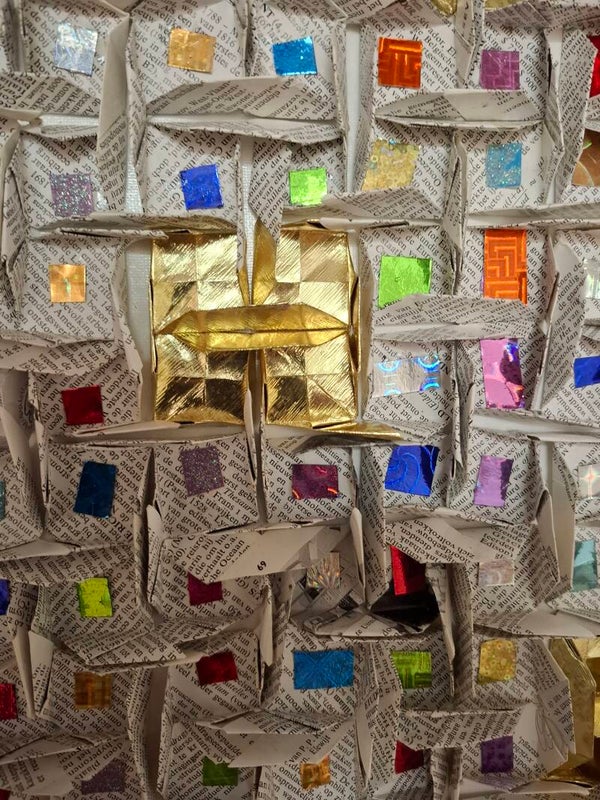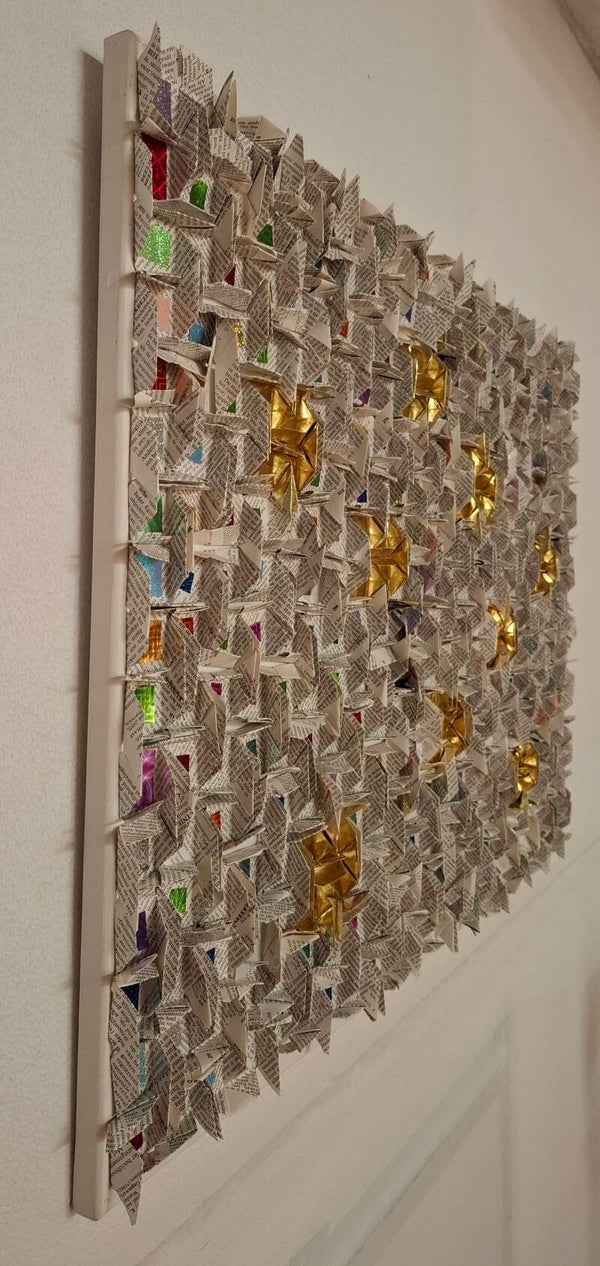 Dit schilderij is opgebouwd uit modulaire origami, met daarin glimmers. Ik zie het als dat alle mensen iets goeds in hen hebben een sparkling. Er zijn weinig mensen die geheel goud zijn. 50x70cm