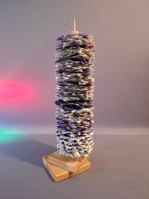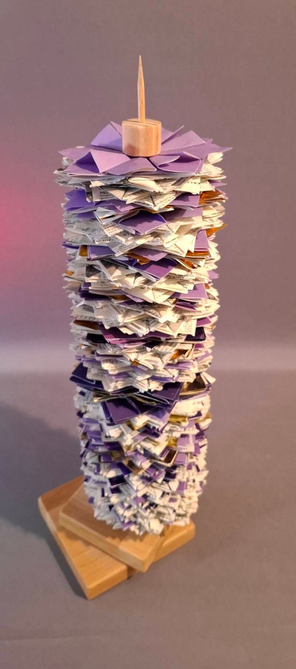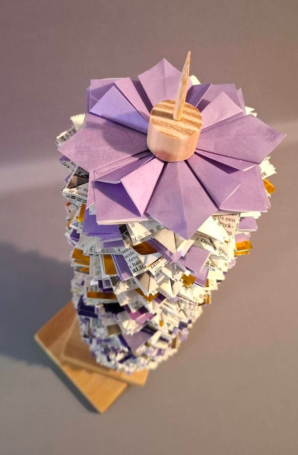 Gemaakt met veel vouwwerk, boek, paars en goud. modulaire origami. Geplaatst op een apartexstandaard en afgesloten met mooi blokje. Heeel apart.