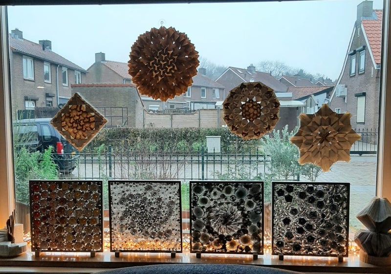 Ooit als kind heb ik het boek "de 1000 kraanvogels",gelezen en gehuild. Ik werd zelf chronisch ziek, ging als pijnmeditatie vouwen. Met de 1000 kraanvogels in mijn achterhoofd vertaald naar Nederland, 1000 bloemen gevouwen. Deze lagen een hele tijd in een doos. Het idee kwam om er raamschermen van te maken. Kies je kleur bij jouw interieur.